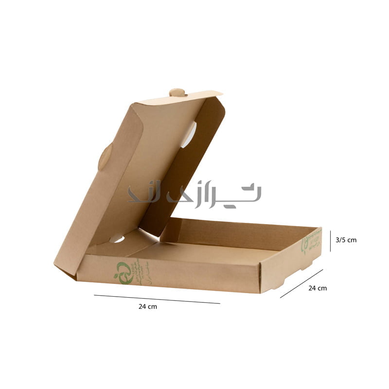 جعبه پیتزا ایفلوت خام 24 از جنس مقوای ایفلوت و عایق حرارتی مناسبی برای گرم نگه داشتن پیتزا می باشد. به دلیل استحکامی که مقوای ایفلوت دارد، این جعبه ها مناسب سفارش های بیرون بر هستند.
