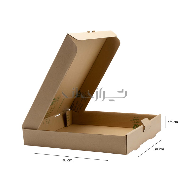 جعبه پیتزا ایفلوت خام 30 از جنس مقوای ایفلوت و عایق حرارتی مناسبی برای گرم نگه داشتن پیتزا می باشد. به دلیل استحکامی که مقوای ایفلوت دارد، این جعبه ها مناسب سفارش های بیرون بر هستند.